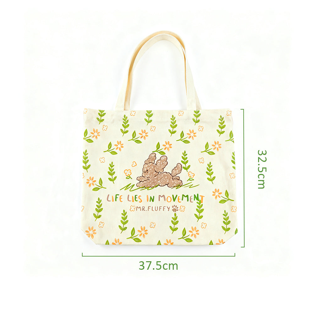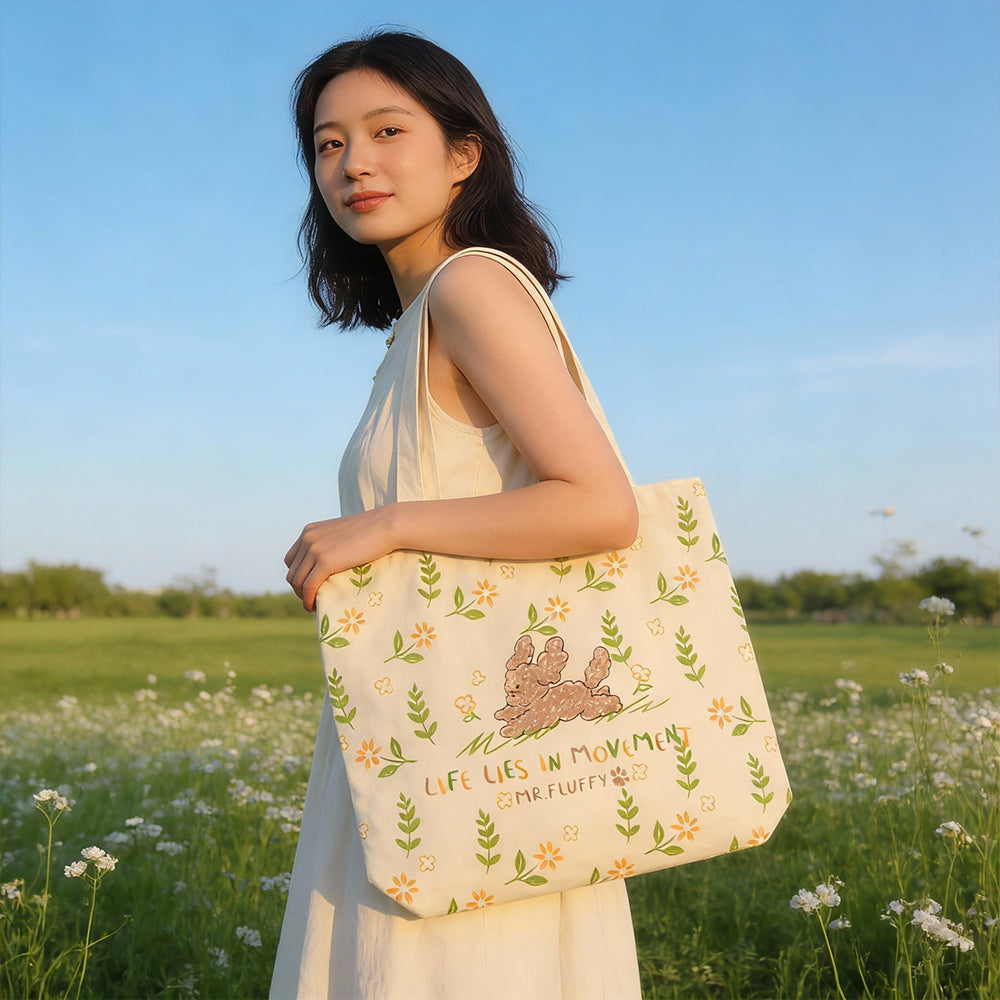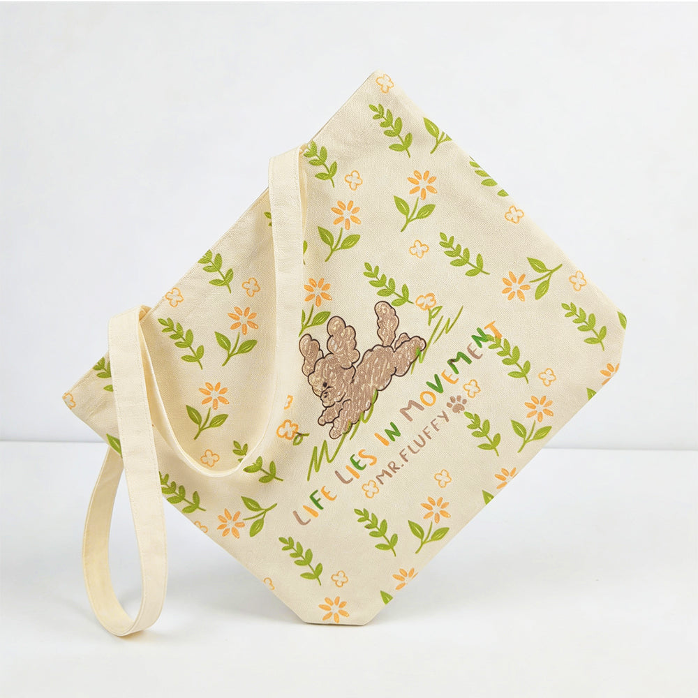 This tote bag showcases a delightful, all-over print of tiny orange flowers and fresh green leaves, centered on a cozy scene of Mr. Fluffy rolling playfully in the grass. The hand-drawn “LIFE LIES IN MOVEMENT” slogan adds a whimsical, uplifting touch, while the soft off-white canvas base keeps the look fresh and versatile. The cute teddy dog print and vibrant botanical details create a warm, approachable aesthetic—perfect for adding a pop of joy to your outfit or brightening up a busy day.