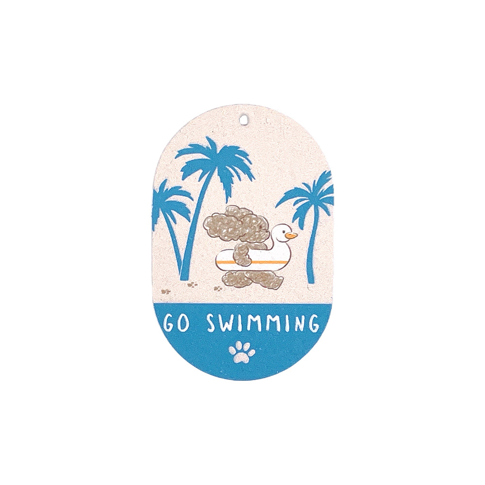 “Go Swimming” (Blue): Mr. Fluffy floats on a rubber duck in a tropical palm scene, bringing summer fun to your sink.